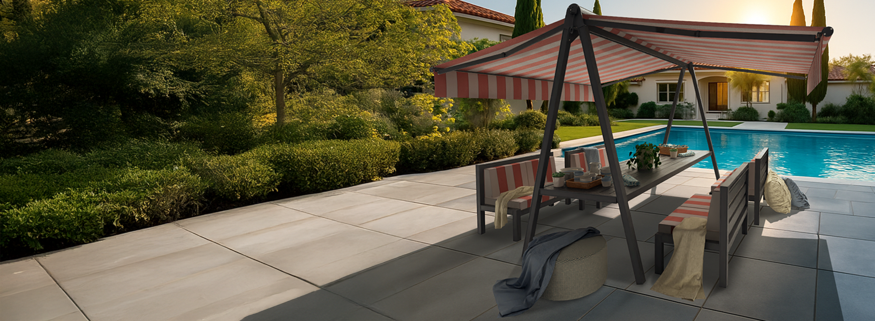 Pergola toile + salon de jardin : profitez d’un coin ombragé raffiné grâce à nos pergolas à toile intégrée, accompagnées de salons design pour accueillir famille et amis.